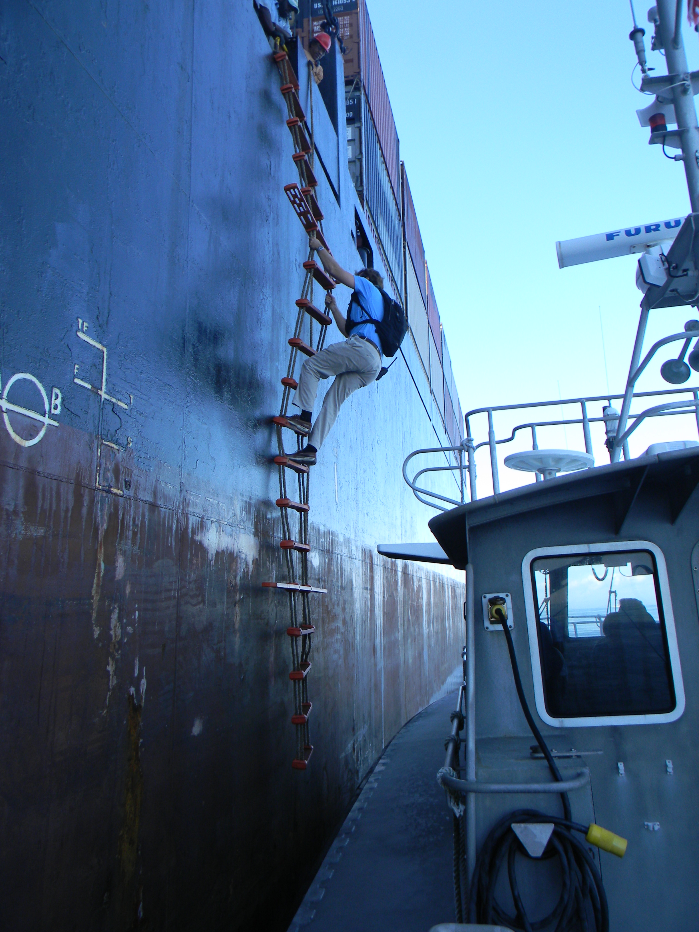 By far, the most dangerous aspect of the job is boarding the large ship. Oftentimes, the pilot climbs up the side of the ship on a rope ladder, which is unstable on warm, sunny days and treacherous in high winds and heavy rains.